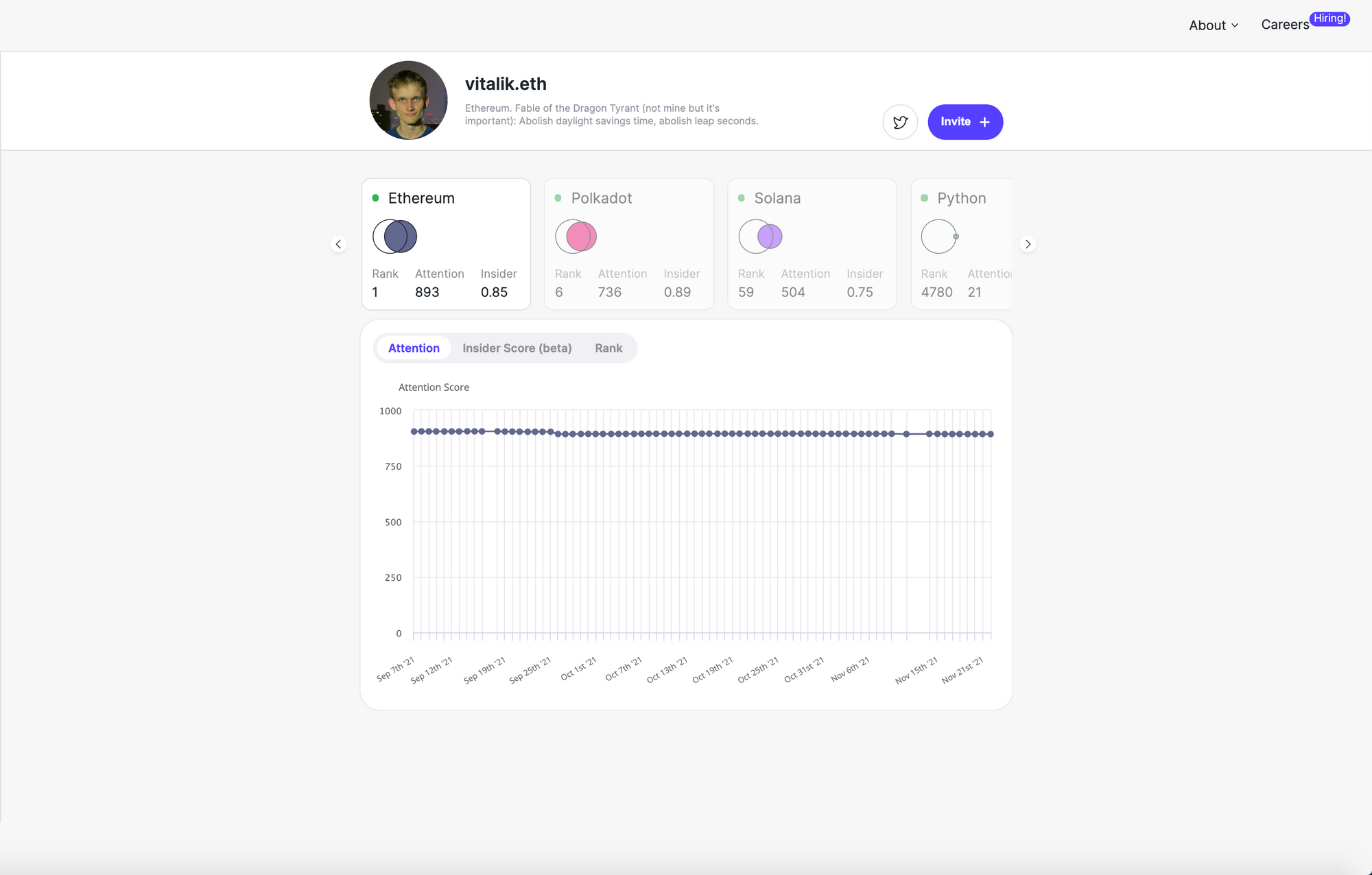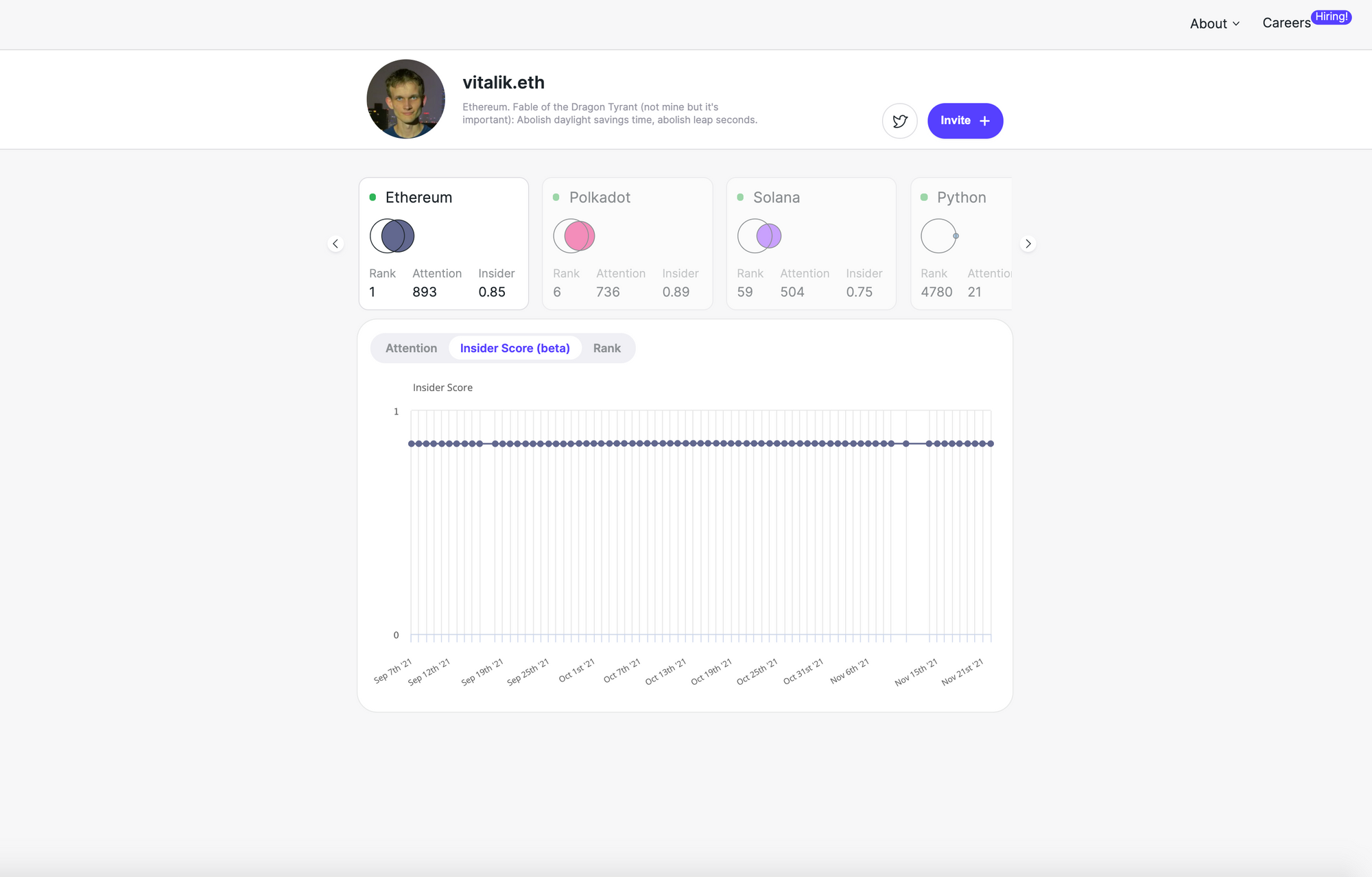 The insider score is a compliment to the attention score. Insider scores tell you whether or not somebody “belongs” in a given community. Your insider score is high if people who pay a lot of attention to other accounts with high scores pay attention to you as well. Vitalik’s insider score is lower than his attention score because he’s followed by many people from outside of the Ethereum community.