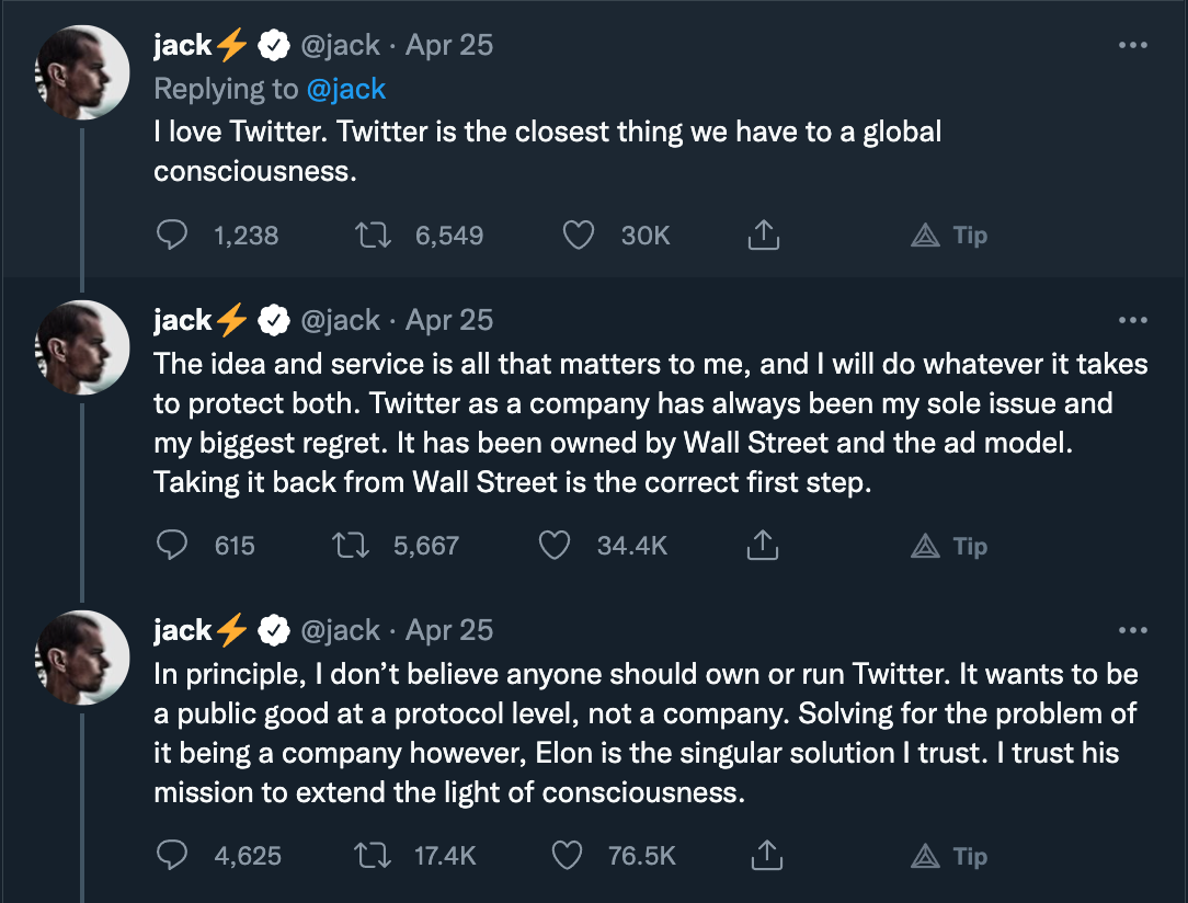 The fact that Jack Dorsey describes Musk as the “singular solution [he] trusts to solve for the issue of Twitter being a company” and as being on “a mission to extend the light of consciousness” makes me cautiously optimistic about his potential to transform Twitter for the better.