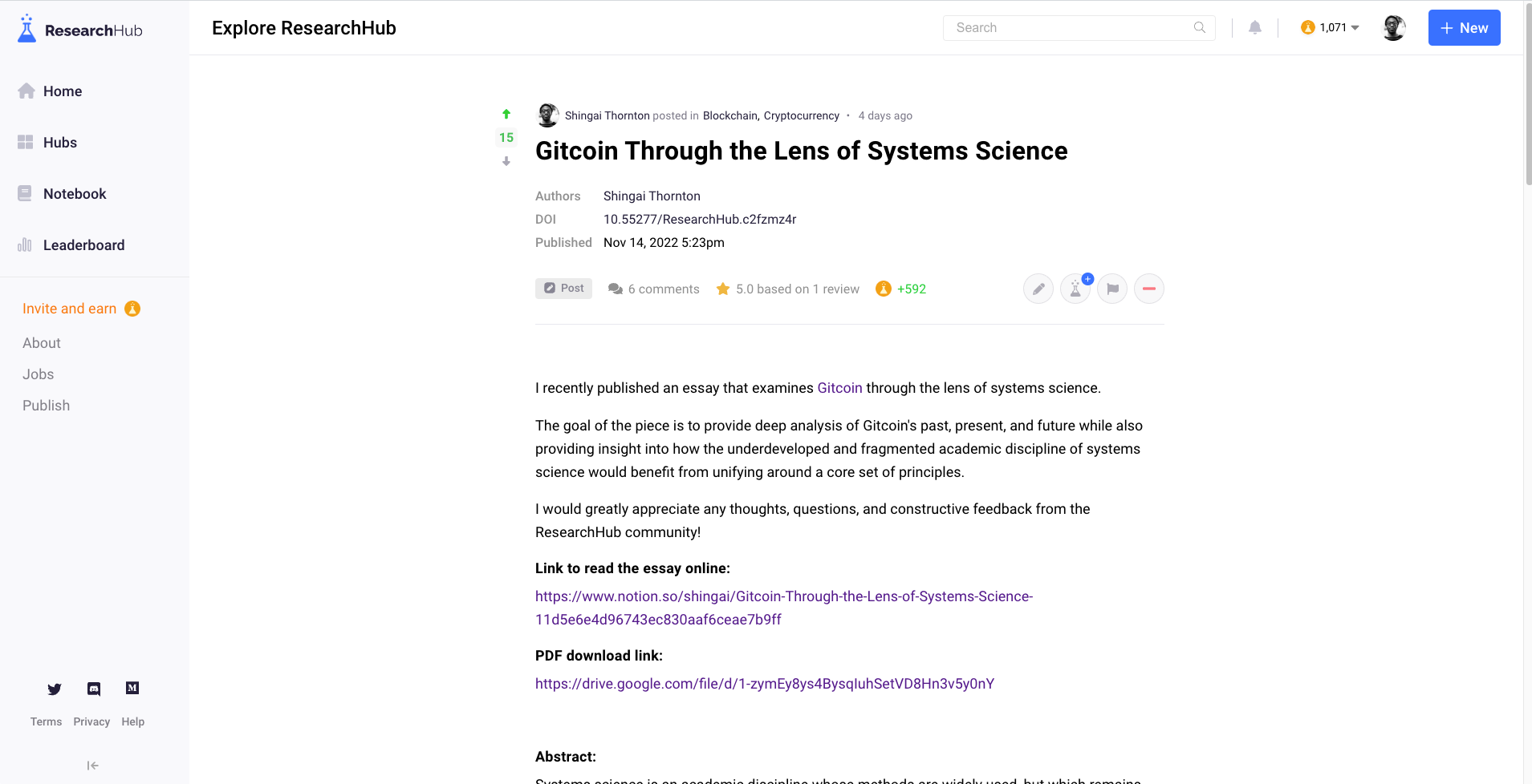 ResearchHub has been on my radar for a while. But it wasn’t until last week that I felt inspired to use it. I recently published an essay on Gitcoin and have been eager for feedback. So I decided to upload my paper to ResearchHub and see what it felt like to use the platform and interact with the community.