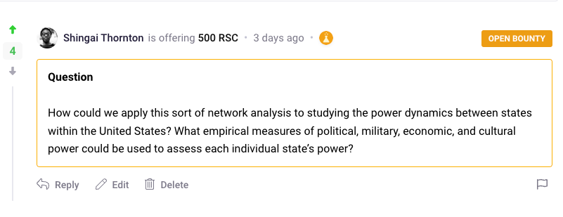 I’ve accumulated 1,071 RSC from upvotes and tips on my posts during my first week on ResearchHub. Once I had some RSC to spend I immediately uploaded one of my favorite papers on network science and posted a question bounty of my own.