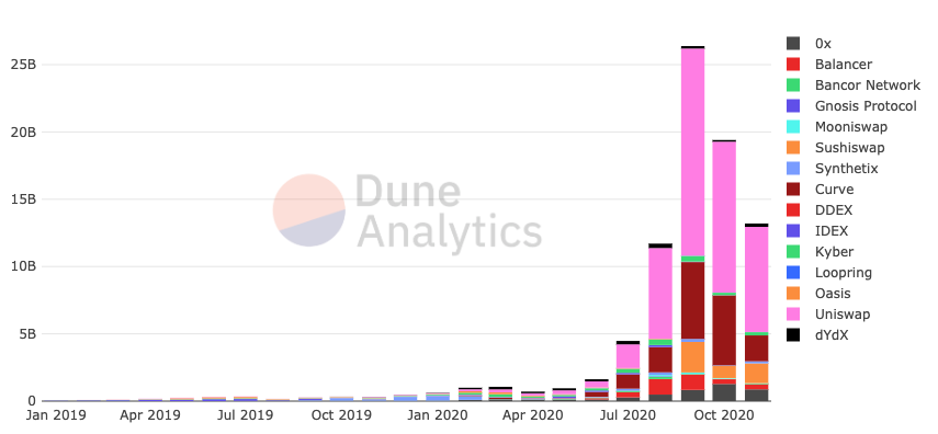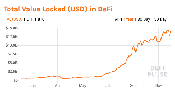 The total value locked in DeFi has grown from $690 million to ~$14 billion over the course of this year, and the number of DeFi users has grown from ~100,000 to ~984,360. Decentralized exchanges have seen a surge in activity while decentralized prediction markets like Augur, Omen, and Polymarket are also gaining traction.