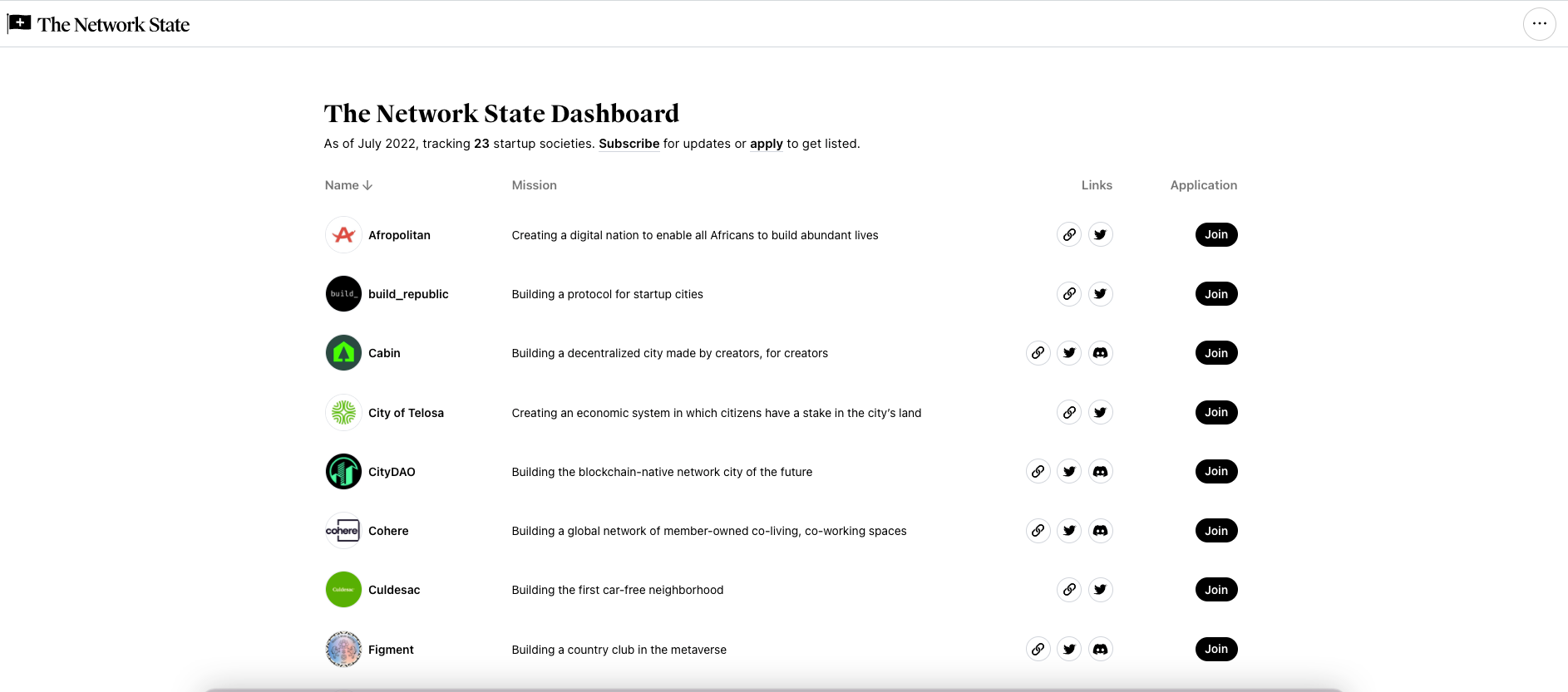 The Network State Dashboard is tracking the growth and progress of startup societies.